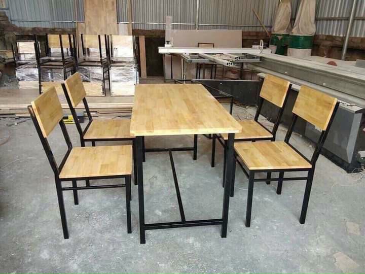Phần khung được làm từ vật liệu sắt sơn tĩnh điện cho độ bền và khả năng chịu lực cao, bề mặt bàn và ghế được làm từ gỗ caosu tự nhiên sơn phủ PU 3 lớp giúp tăng tuổi thọ bề mặt sản phẩm, chống ẩm mốc và khó bong tróc.