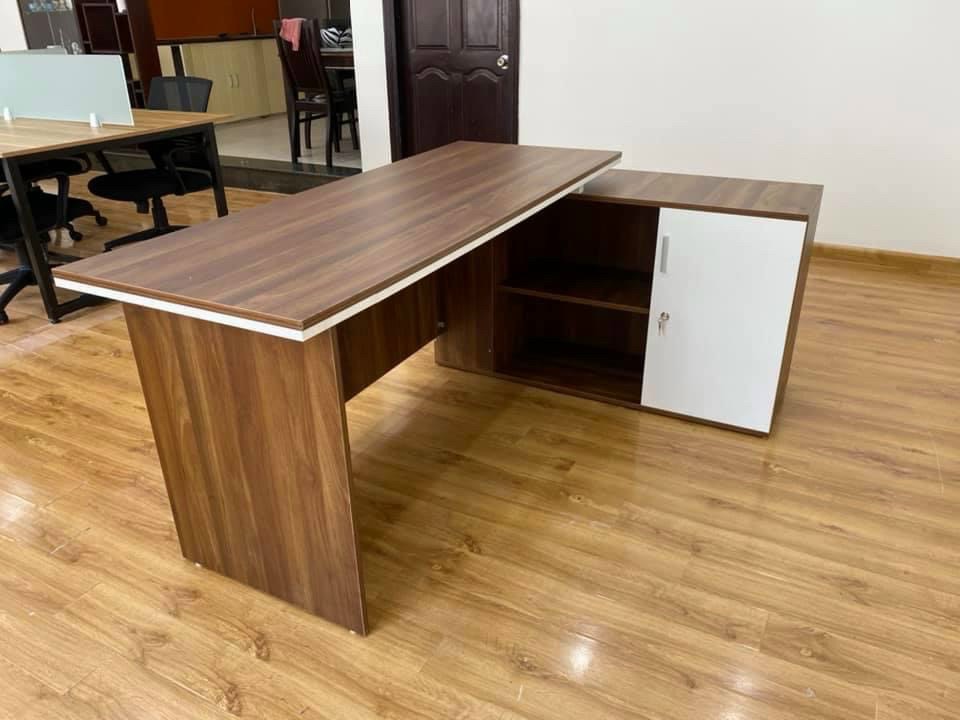 Bàn làm việc giám đốc kèm tủ phụ đây là phiên bản cải tiến của Bàn giám đốc kèm tủ phụ với thiết kế tỉ mỉ hơn, trang nhã hơn khi đan xen giữa các màu gỗ là những đường vân trắng khá bắt mắt, những khối không gian được tạo hình khá tỉ mỉ ở mặt trước, cạnh bàn bo tròn.
