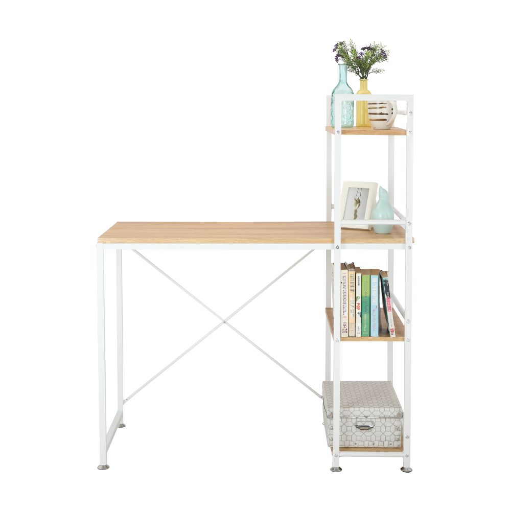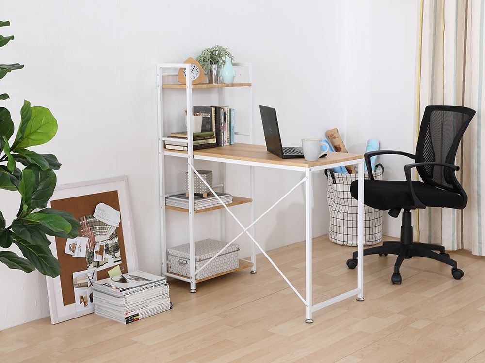 - Có đợt kệ bên 1 góc của bàn để lưu trữ vật dụng và sách vở tiện lợi