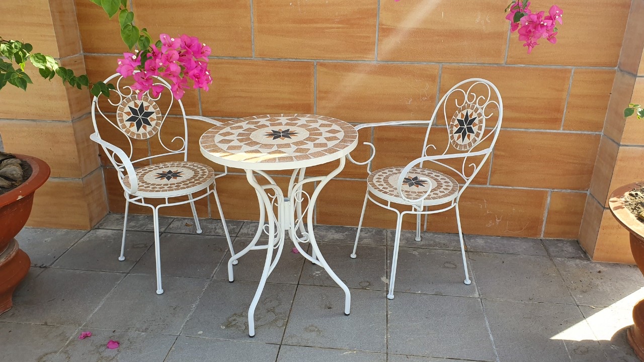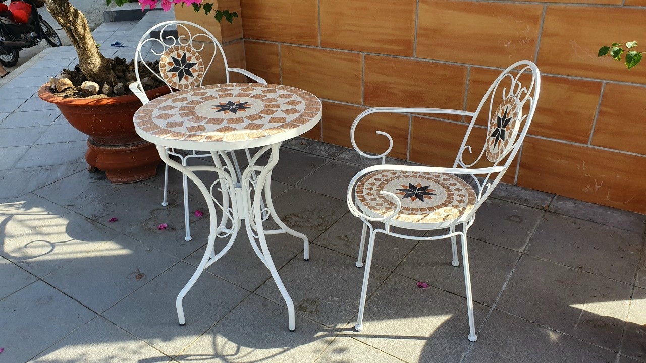 Những mẫu bàn ghế cafe hiện đại làm bằng sắt khảm gạch men mosaic là sự lựa chọn hàng đầu khi trang trí quán cafe sân vườn. Chất liệu sắt đặc nghệ thuật được phun sơn tĩnh điện góp phần ngăn ngừa hiện tượng gỉ sét từ bên trong.