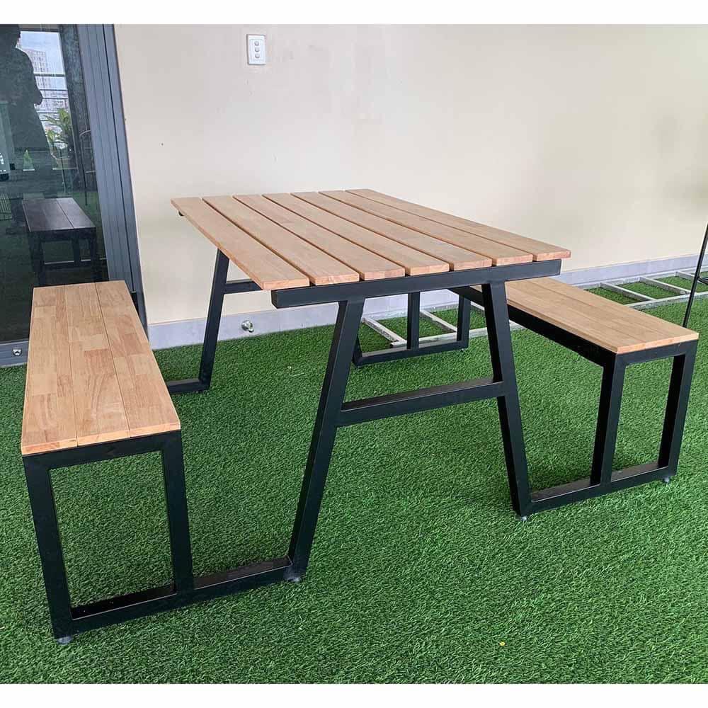 Một sản phẩm với độ bền cao, thích nghi với thời tiết tốt  cùng khả năng chống thấm nước và dễ dàng vệ sinh. Bộ bàn ghế gỗ liền bàn  khung sắt thích hợp cho quán ăn, nhà hàng ngoài trời.