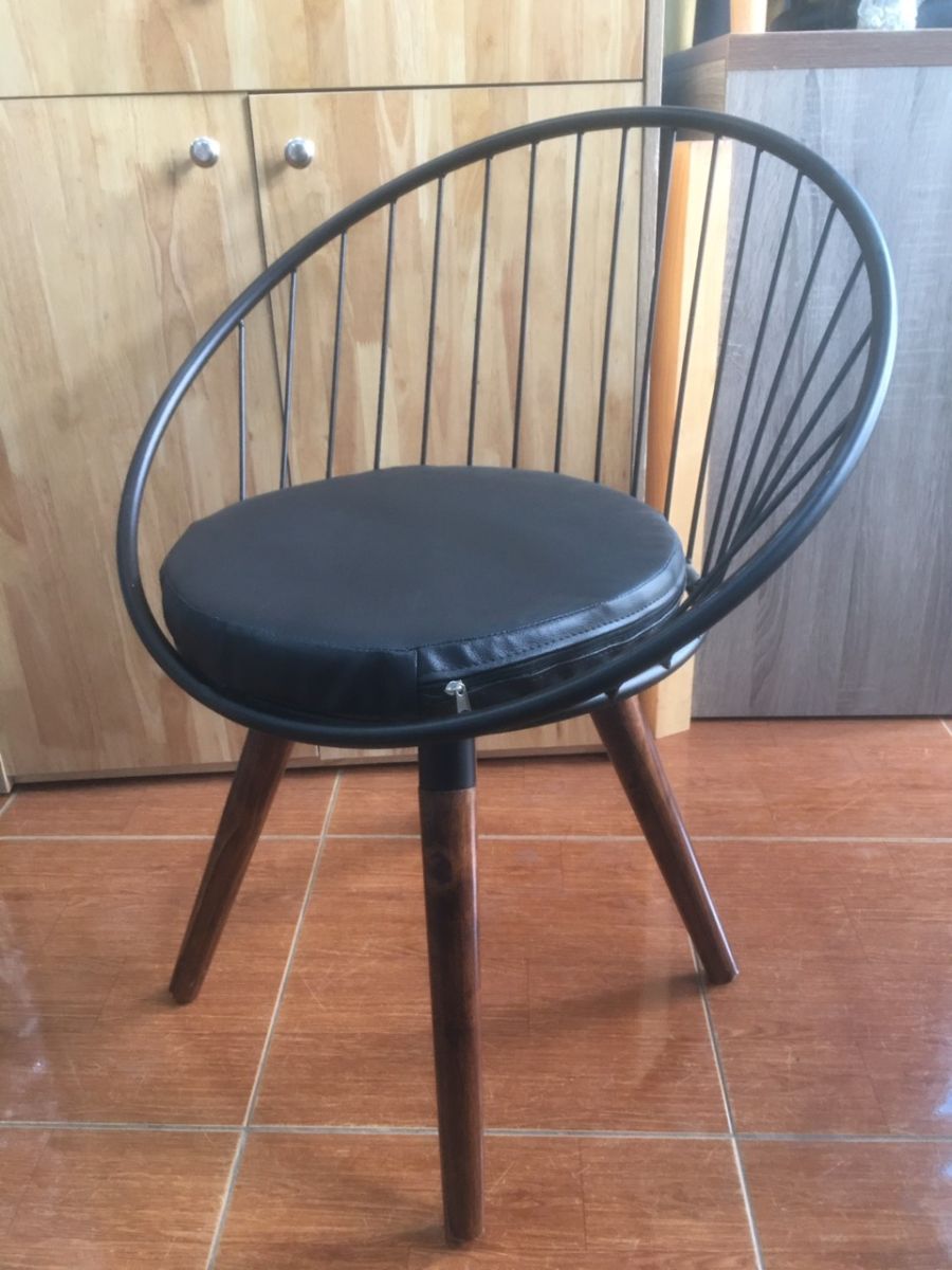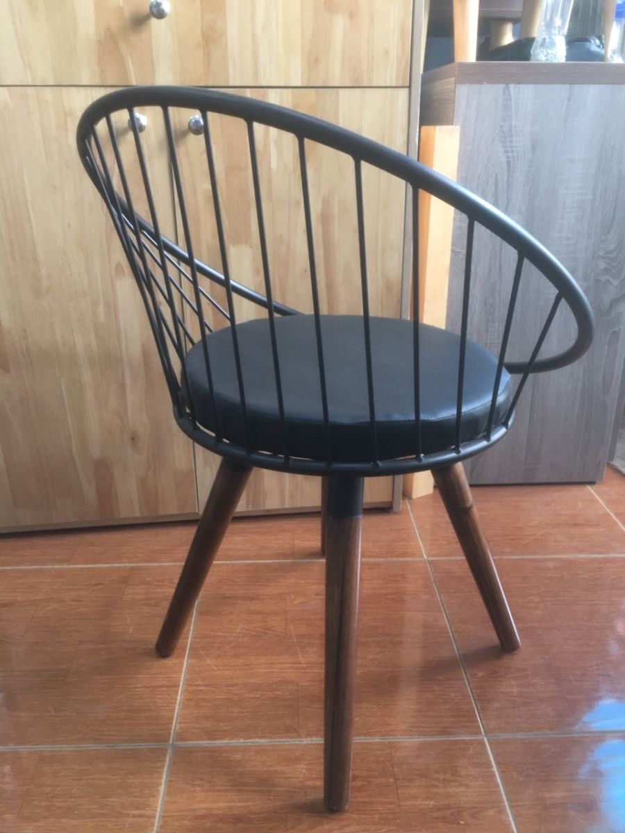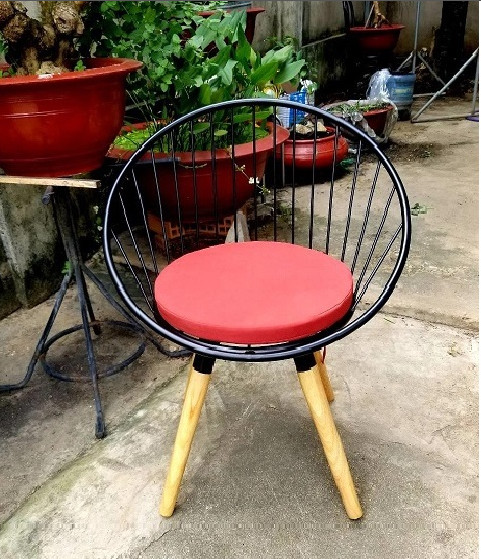 Chất liệu bao gồm: Khung sắt tròn, công nghệ sơn tỉnh điện, chân ghế gỗ cao cấp, nệm bọc simili
