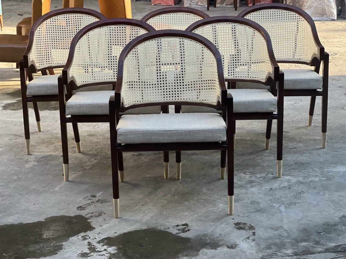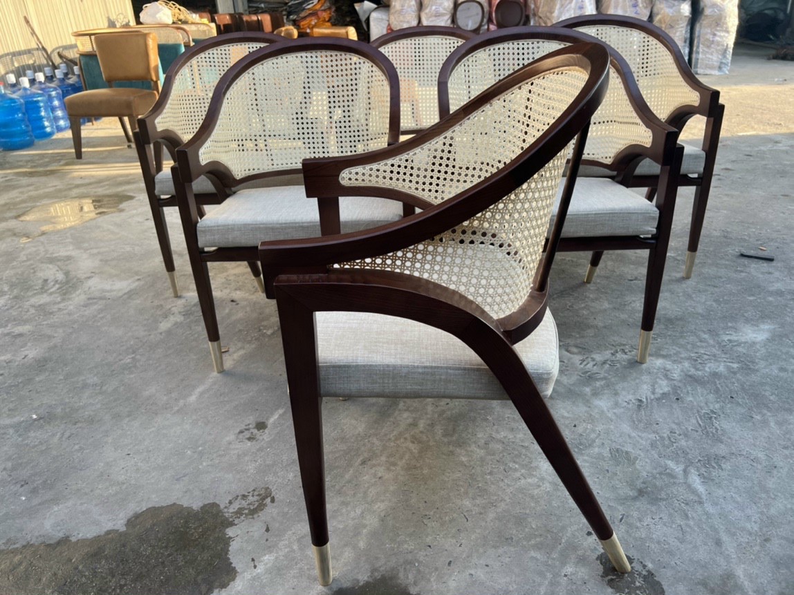 Chất Liệu: Gỗ Tần Bì- Mây đan tự nhiên -  nệm simili hoặc vải màu sắc theo yêu cầu, chân bọc đồng