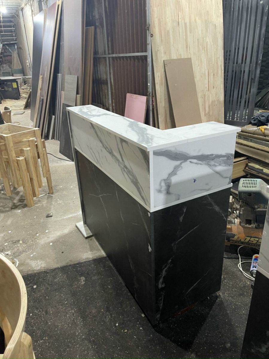 Được chỉ định chế biến từ gỗ công nghiệp, nguồn nguyên liệu nhập khẩu từ Malaysia với độ nén AC cao có thể chựu được thời tiết hay khí hậu ẩm thấp, không bị bong chóc, phồng dộp, bề mặt quầy lễ tân được dán lớp nguyên liệu giả đá trông rất ấn tượng giống hệt đá tự nhiên. Sạch sẽ và chất lượng bền lâu.